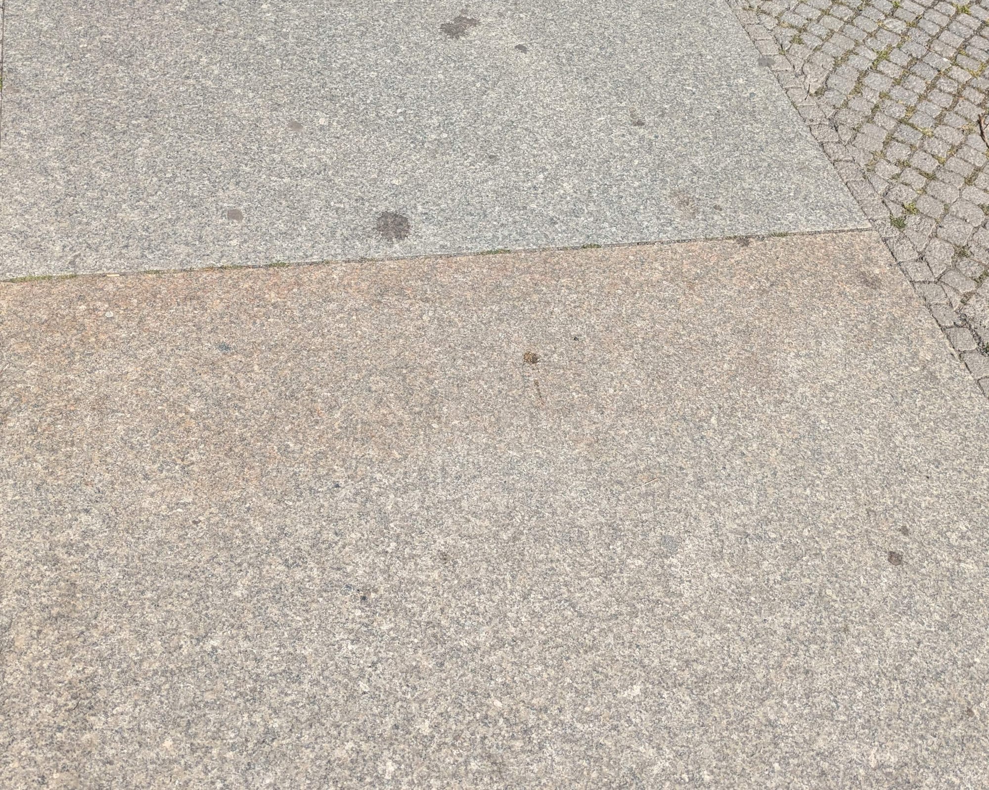 Zurück zu unseren Schweinebäuchen: Wer mit gesenktem Blick durch Berlin läuft, dem fallen unterschiedliche Farbschläge der Platten auf. Neben der unterschiedlichen Herkunft und Zusammensetzung (siehe oben) kann hierfür auch ein Prozess bei der Plattenherstellung verantwortlich sein. Im Regierungsviertel liegen relativ neue Granitplatten aus Striegau in einem rot-bräunlichen Ton. Der ursprünglich eher gelbe Granit wurde geflammt und dadurch wurden eisenhaltige Minerale zu Hämatit oxidiert.