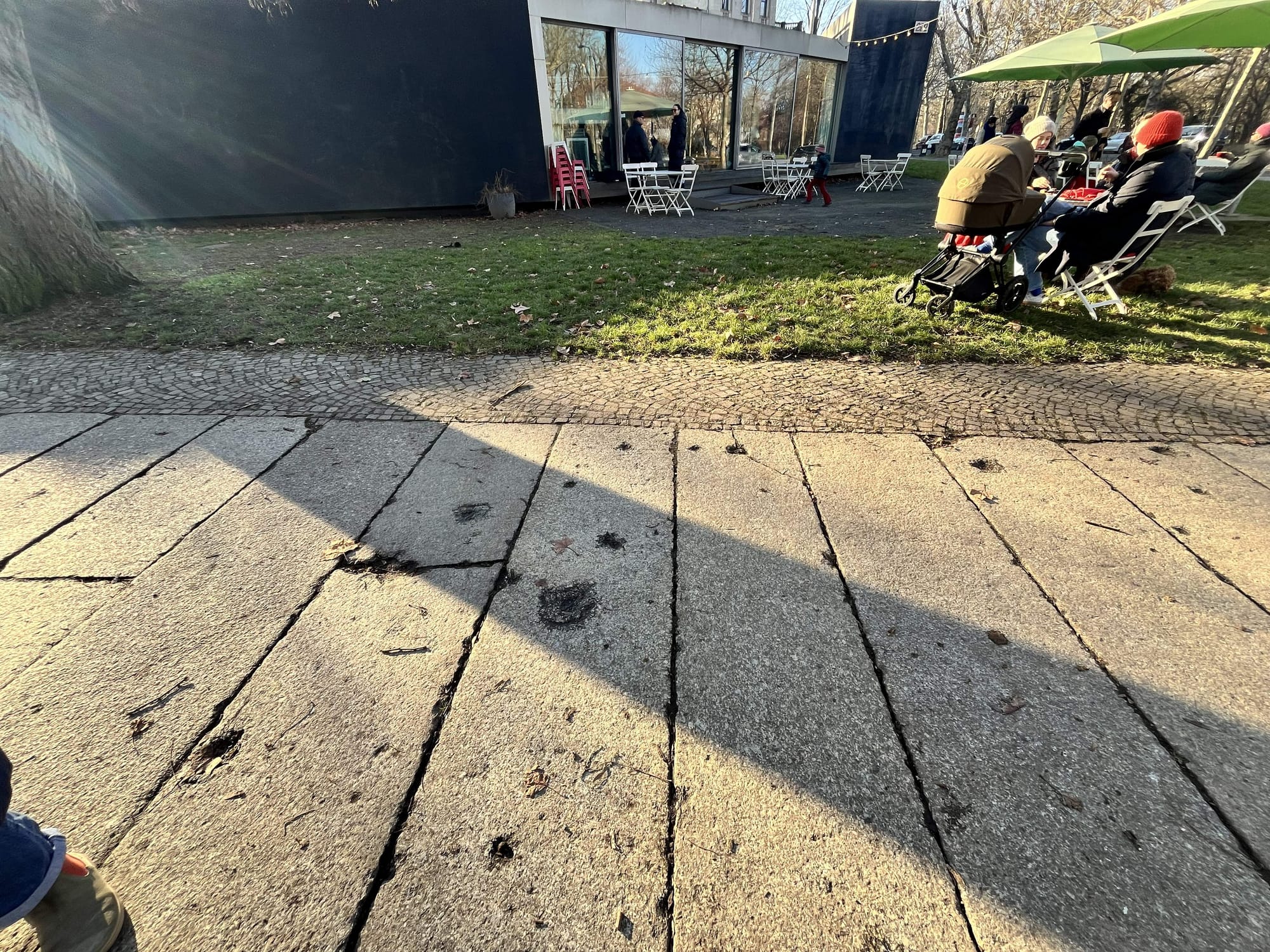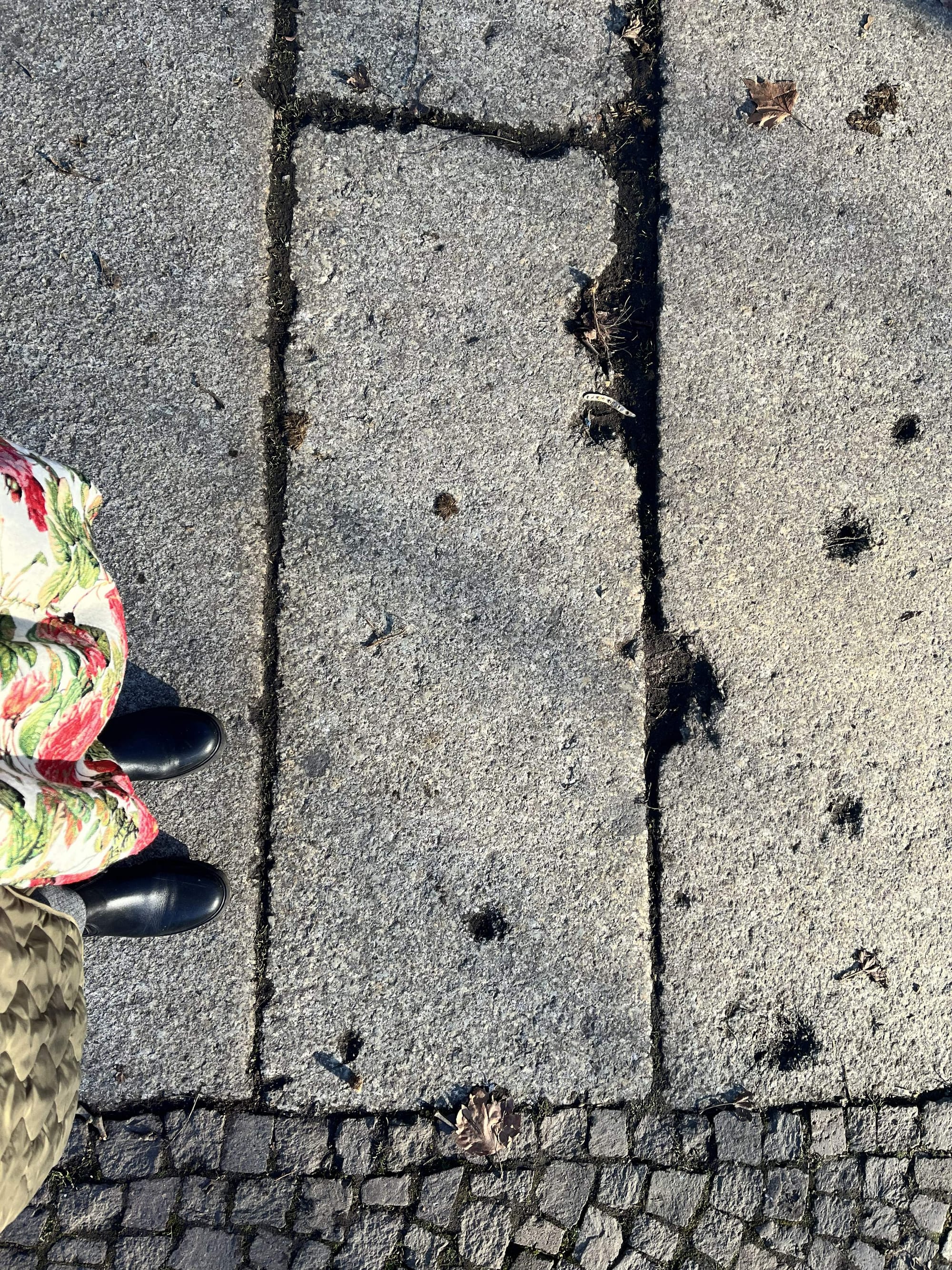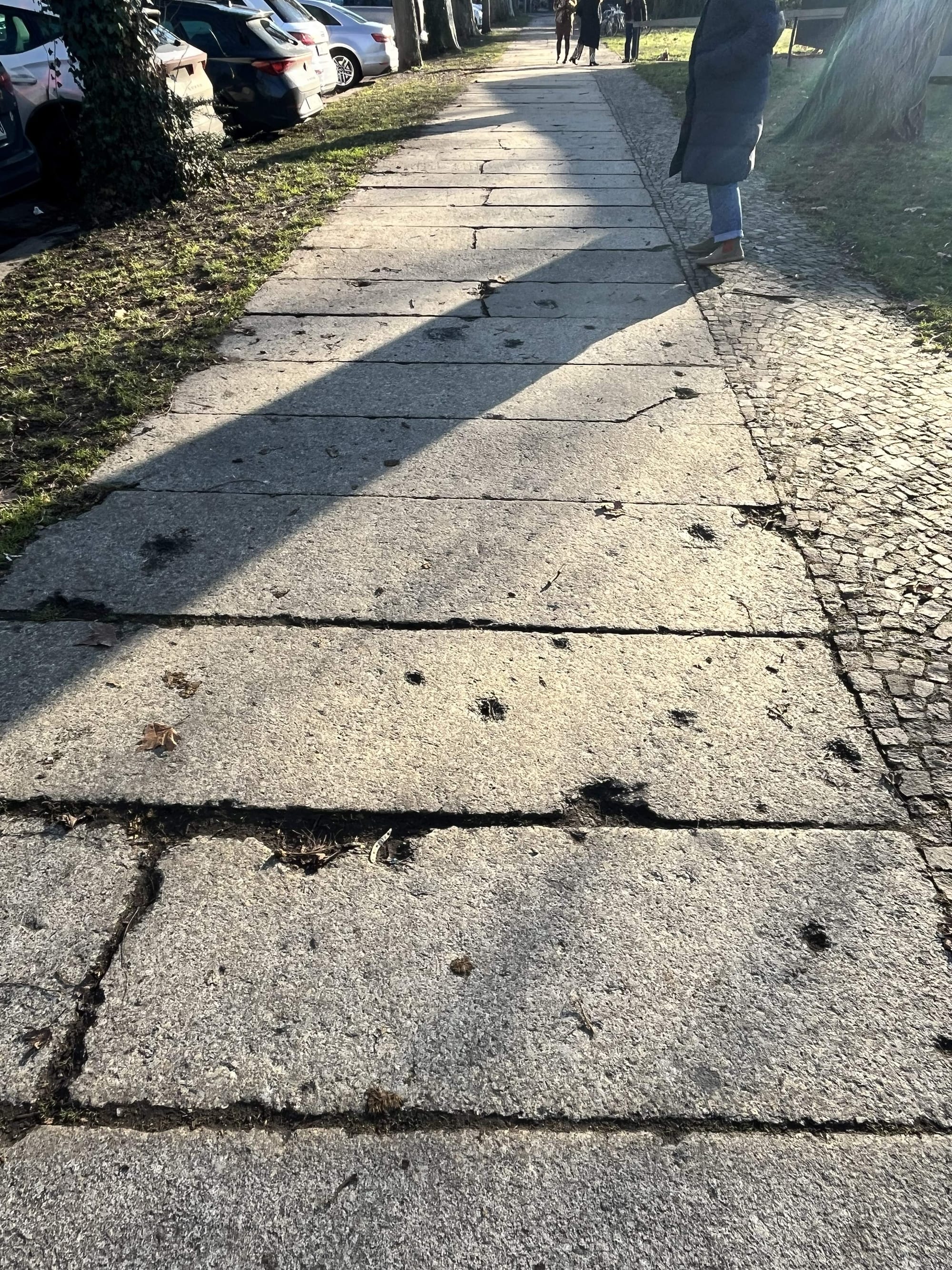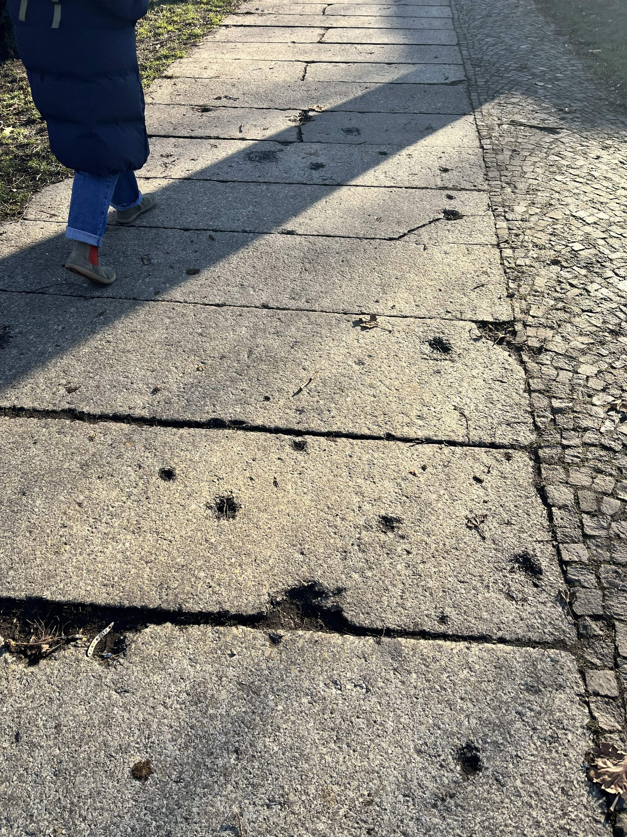 Die Fotos für diesen Artikel entstanden im Rahmen des Forschungsprojekts "Kulturgeschichte(n) des Straßenpflasters" und wurden mir zur Verwendung in meinem Blog überlassen. Es handelt sich um multiple, gleichartige Beschädigungen über mehrere Platten. Passige Anschlussbeschädigungen fehlen jedoch. Bemerkenswert sind hier die Krater mit konzentrisch umlaufenden Ringen.