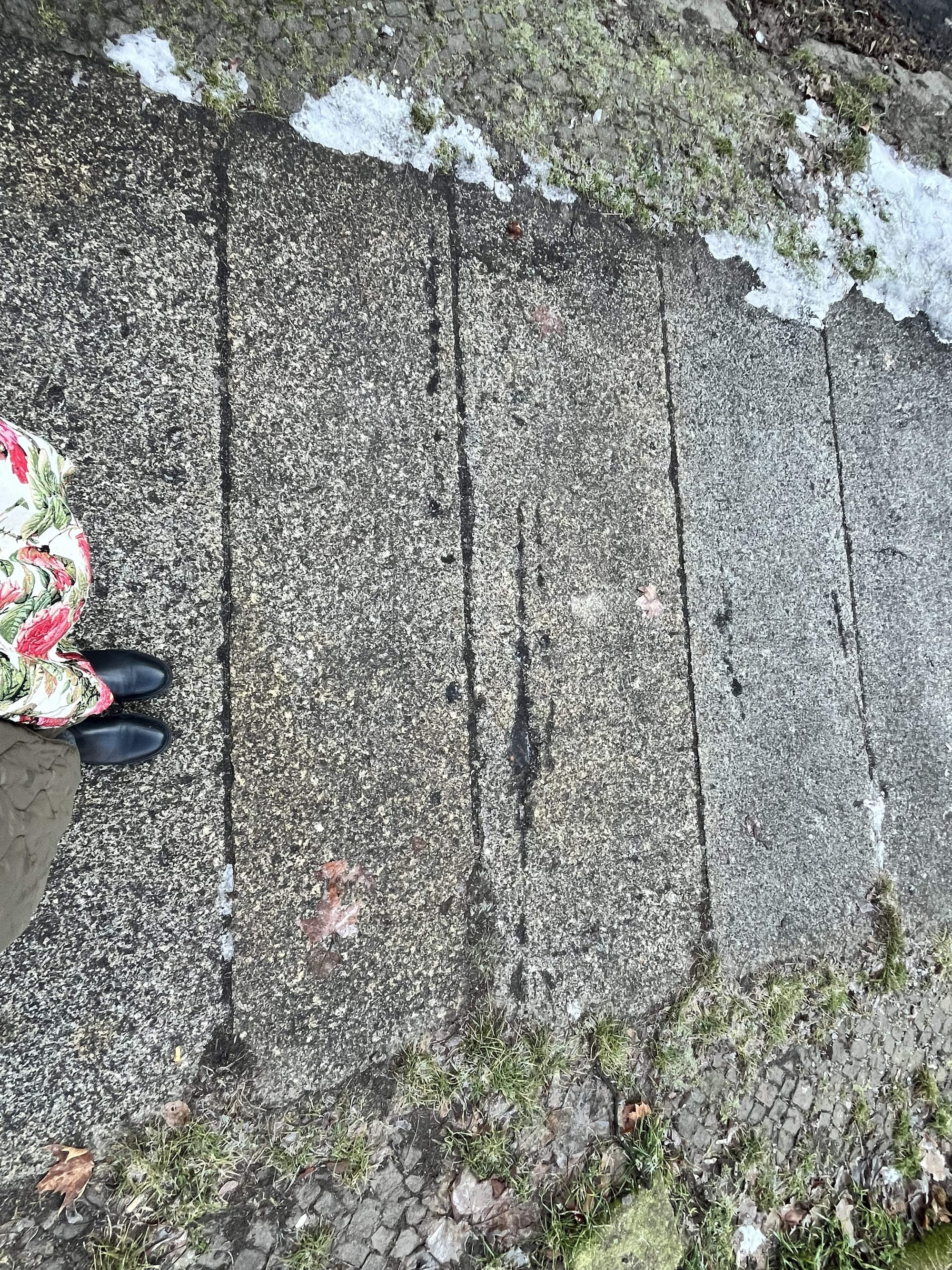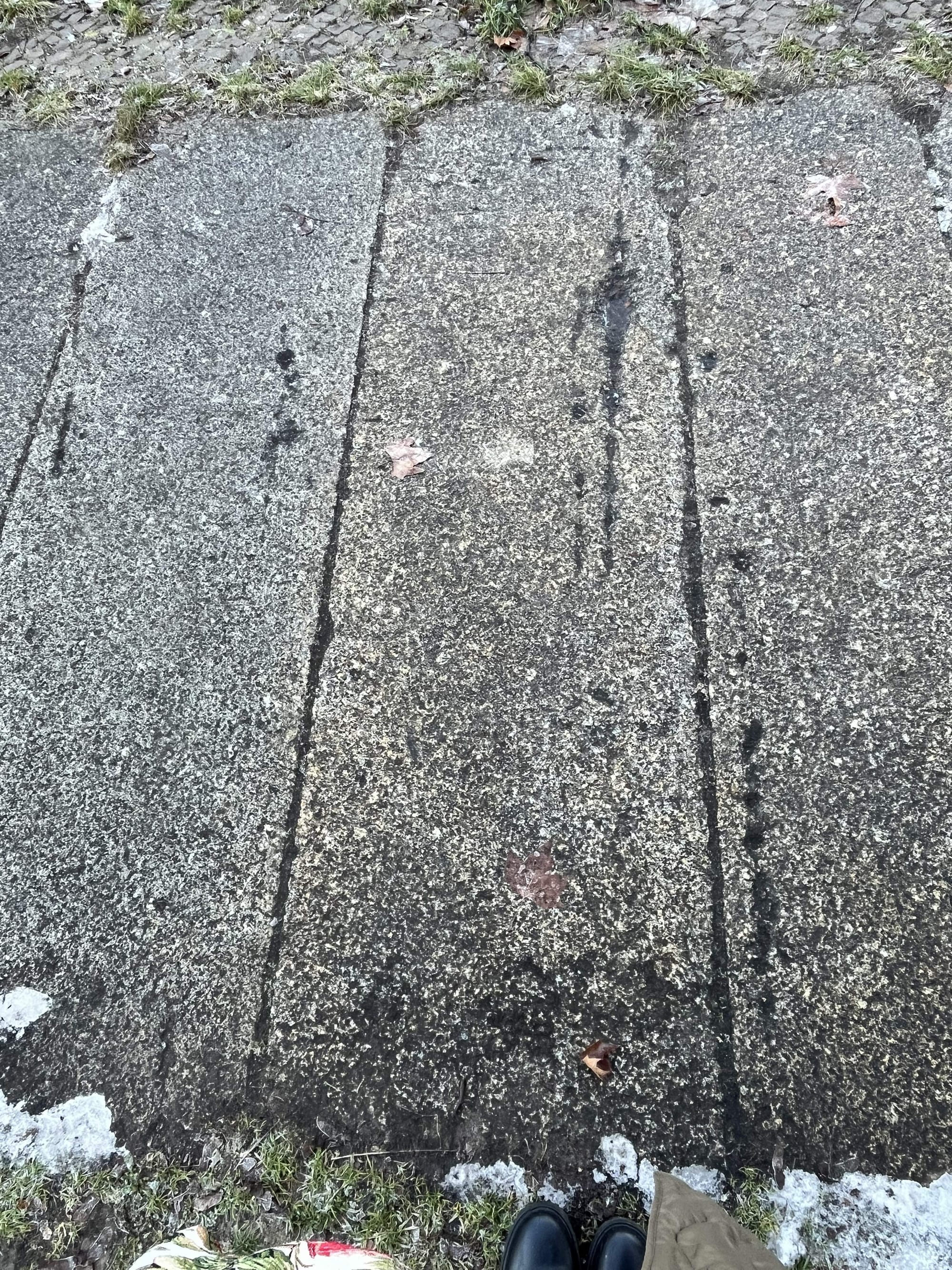 Die Fotos für diesen Artikel entstanden im Rahmen des Forschungsprojekts "Kulturgeschichte(n) des Straßenpflasters" und wurden mir zur Verwendung in meinem Blog überlassen. Es handelt sich um multiple lange Schmarren, die auf mehreren Platten parallel verlaufen. Es ergibt sich ein kohärentes Schadensbild.