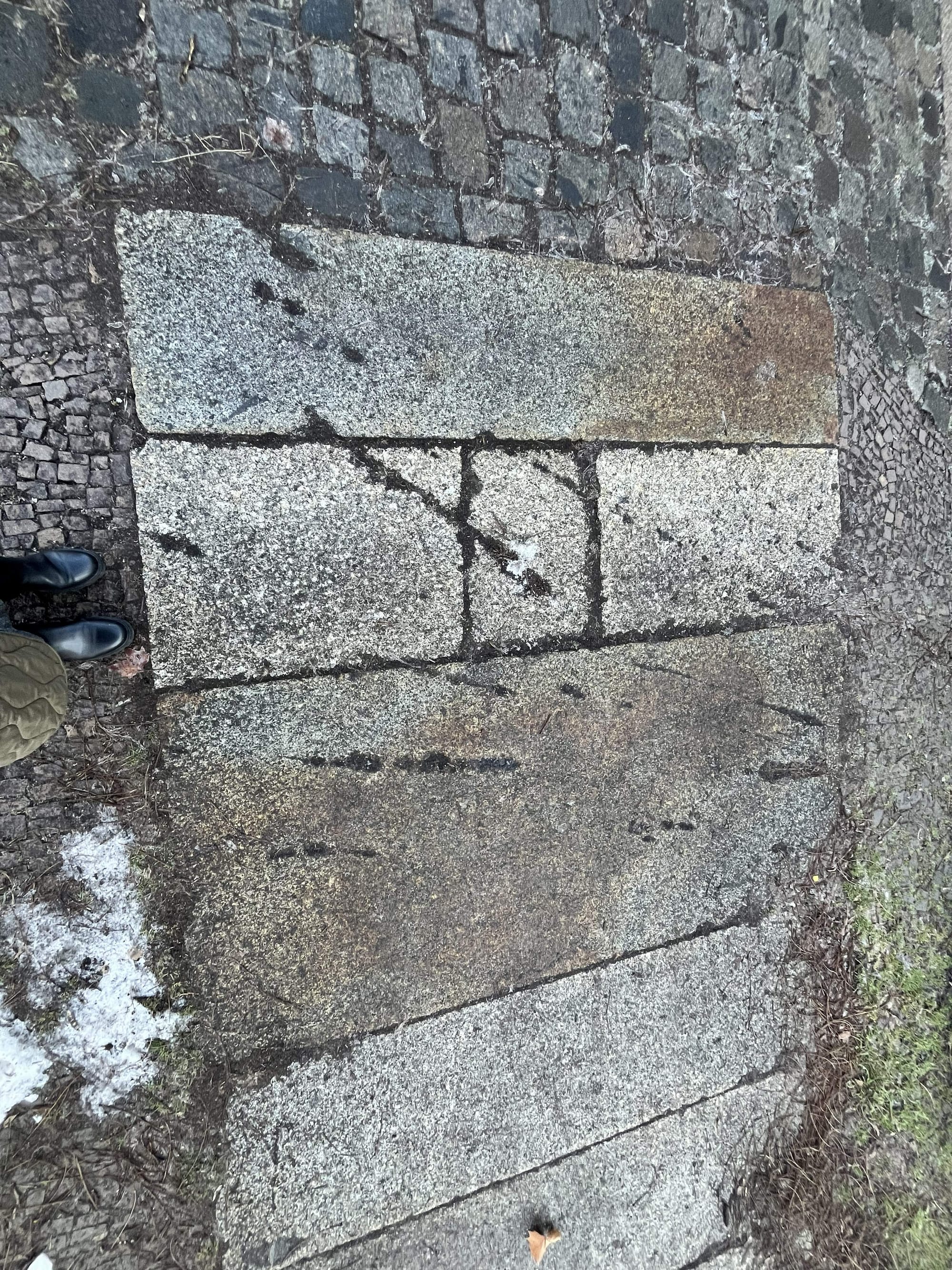 Die Fotos für diesen Artikel entstanden im Rahmen des Forschungsprojekts "Kulturgeschichte(n) des Straßenpflasters" und wurden mir zur Verwendung in meinem Blog überlassen. Es handelt sich um multiple lange Schmarren, die fächerförmig auf mehreren Platten verlaufen und Anschlussbeschädigungen bilden. Es ergibt sich ein kohärentes Schadensbild.
