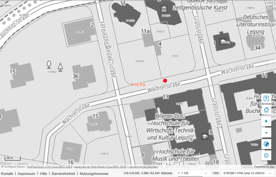 | Adresse: | Wächterstr. (gegenüber Hausnummer 13), 04107 Leipzig |