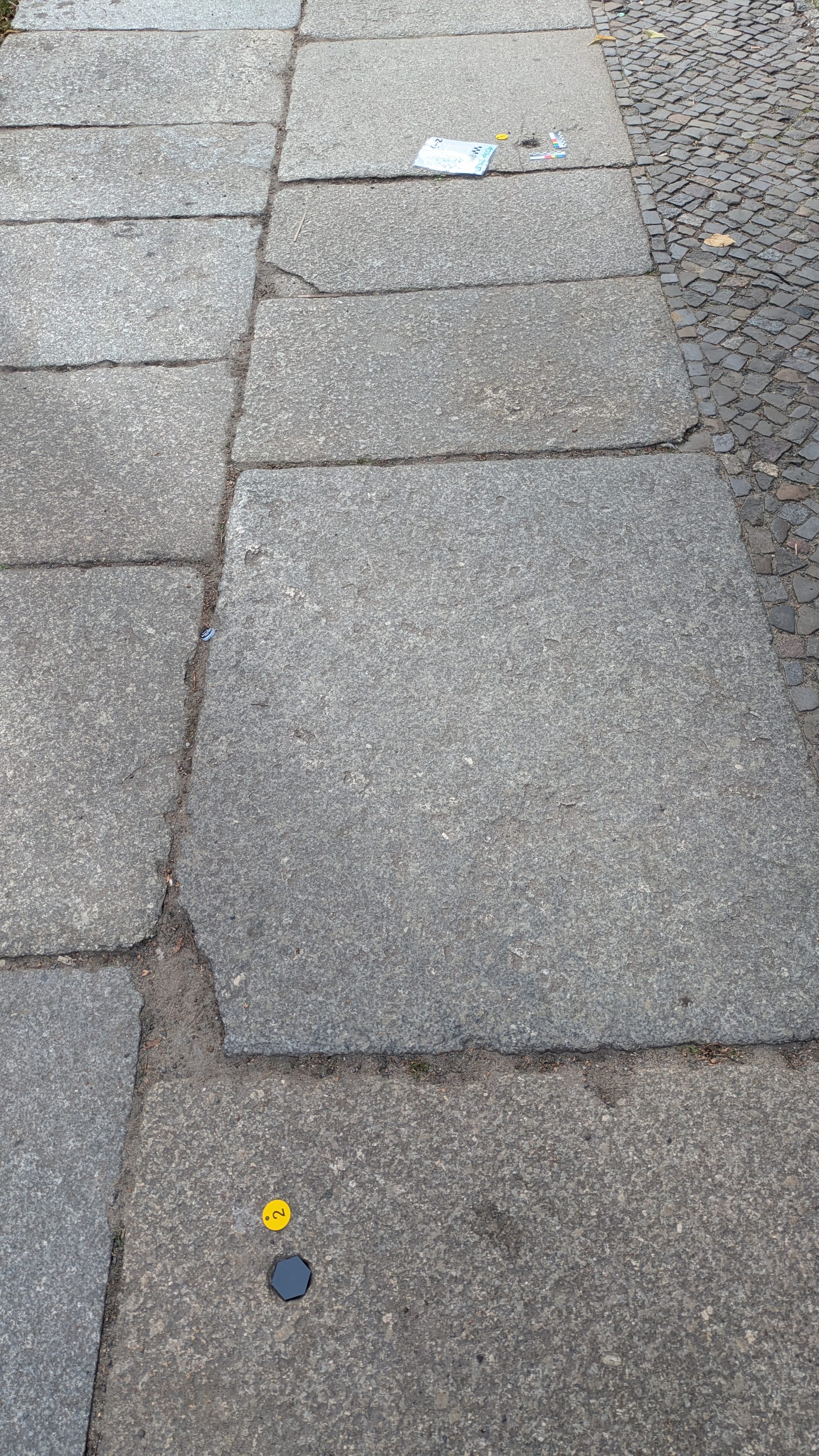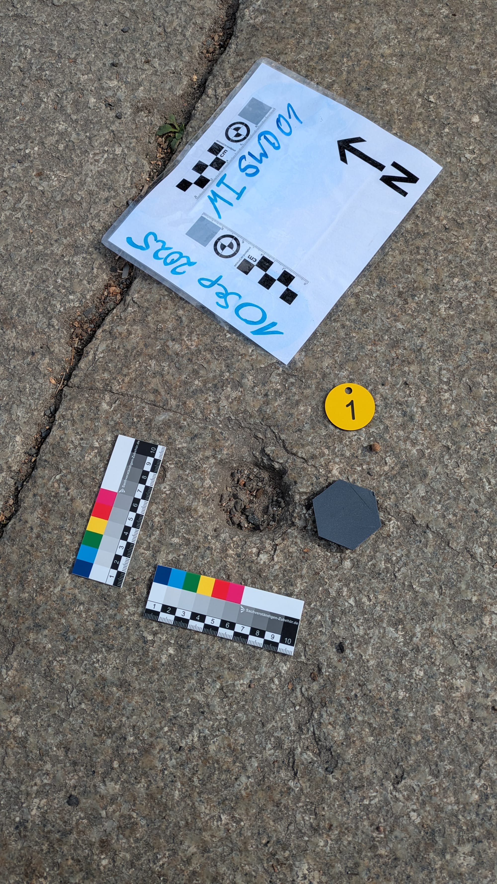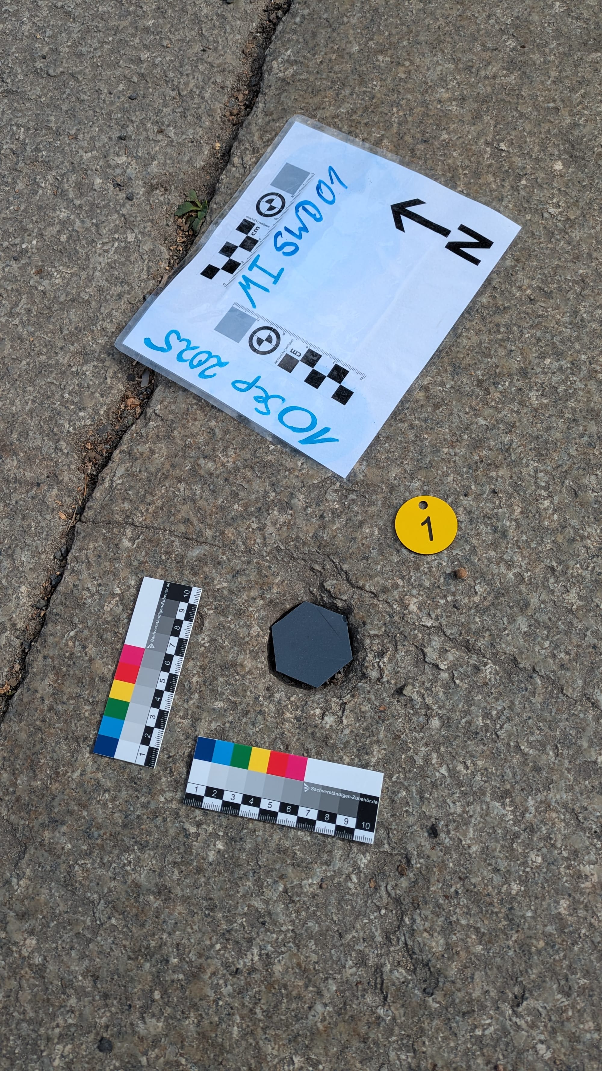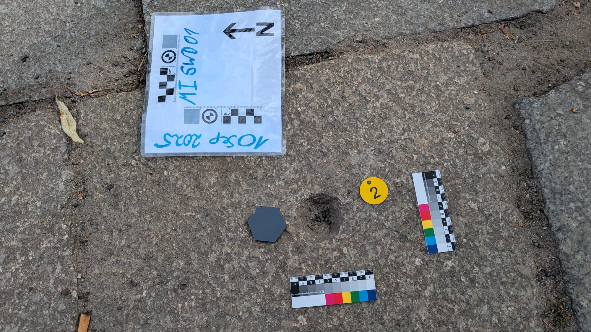 5cm | rund | größte Vertiefung im mittleren Bereich, nur eine Stelle maximaler Vertiefung, Frakturlinie bei MISWD01.1, INC4LB-Schablone passt in Krater und hat Anlehnungskanten[1] |