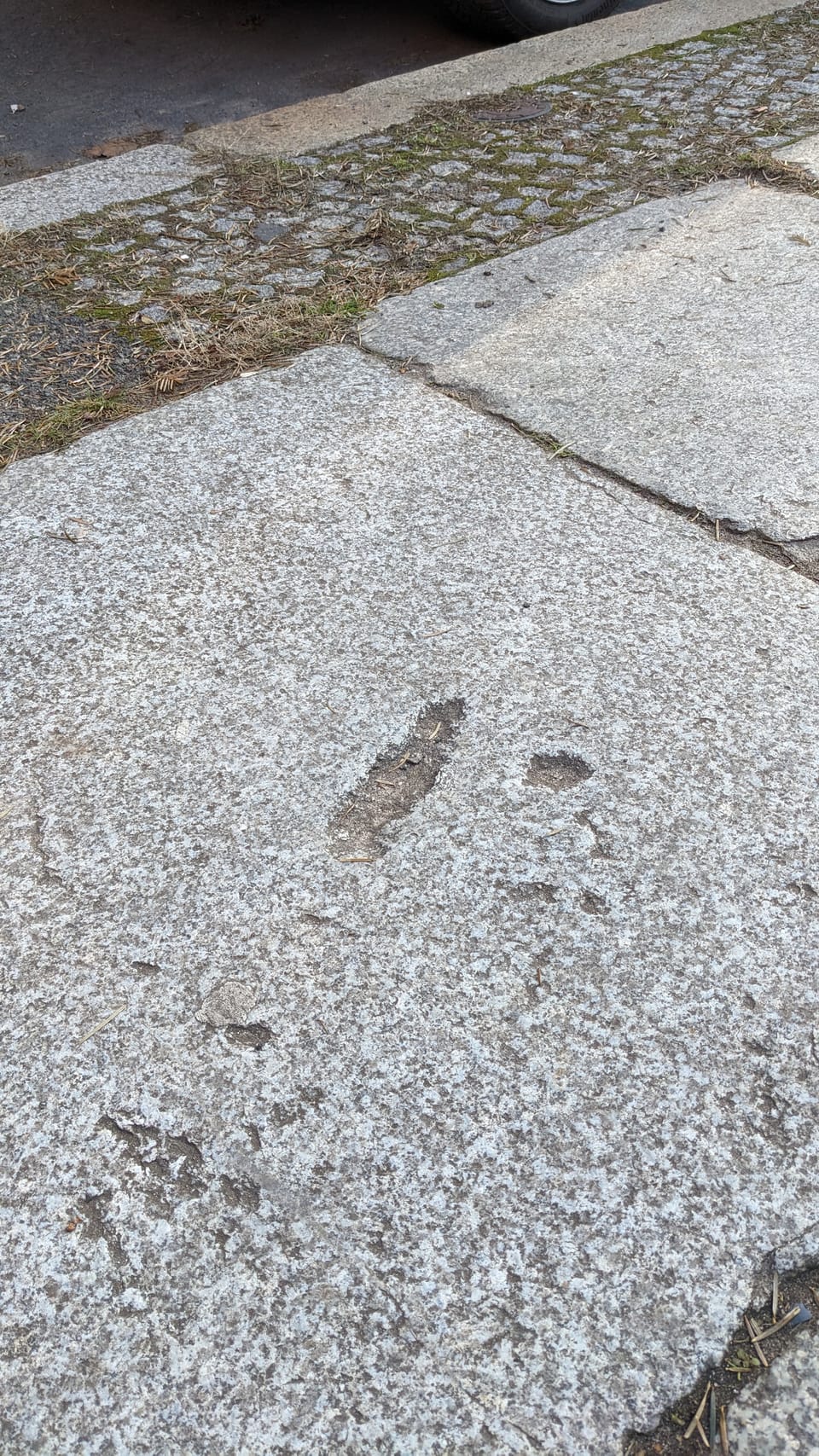 Die Beschädigung an den Gehwegplatten weisen eine für Kriegsbeschädigungen untypische Form auf. Im direkten direkten Umfeld gibt es zwei gebrochene Schweinebäuche. Im weiteren Umfeld gibt es typische Kriegsbeschädigungen und eine große Menge Schweinebäuche aus dem 19. Jahrhundert.