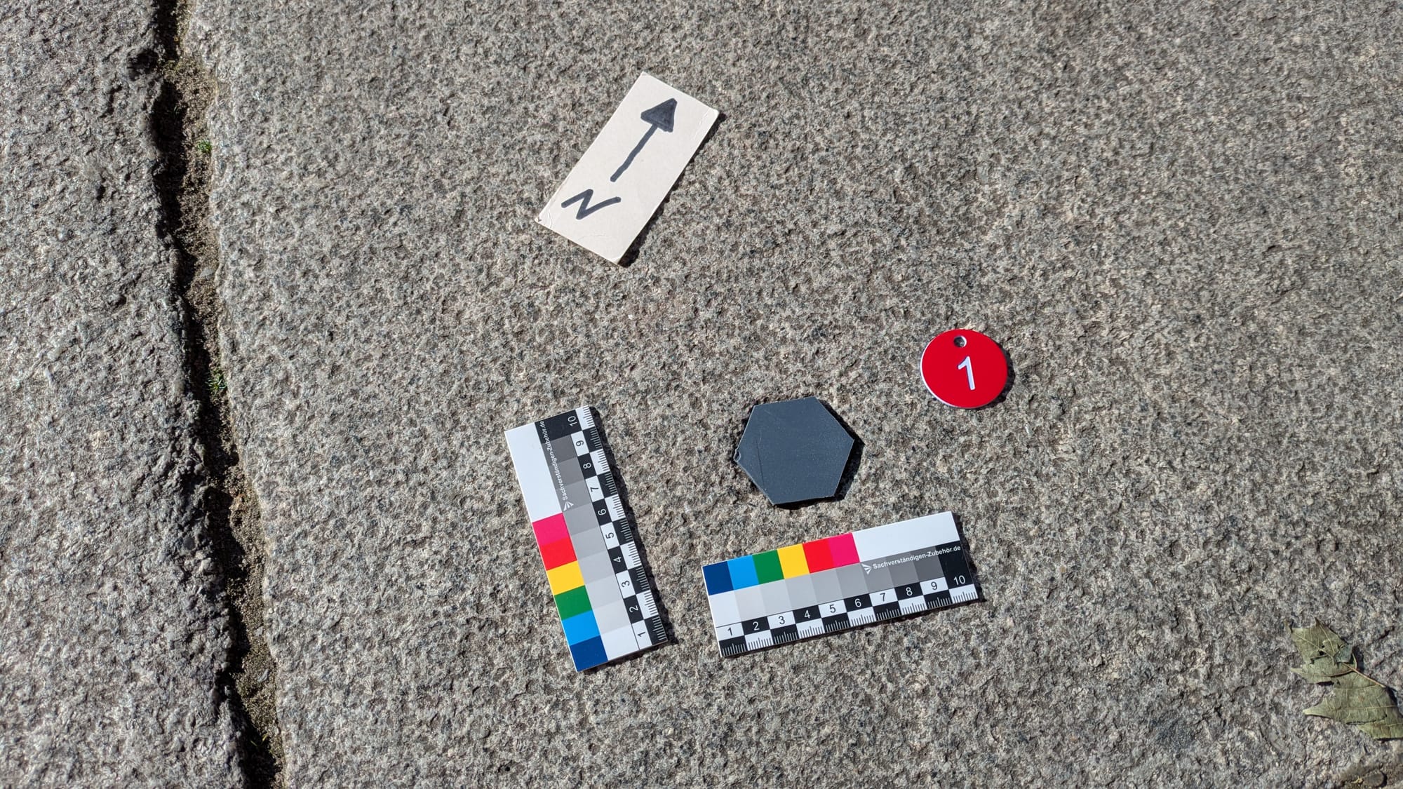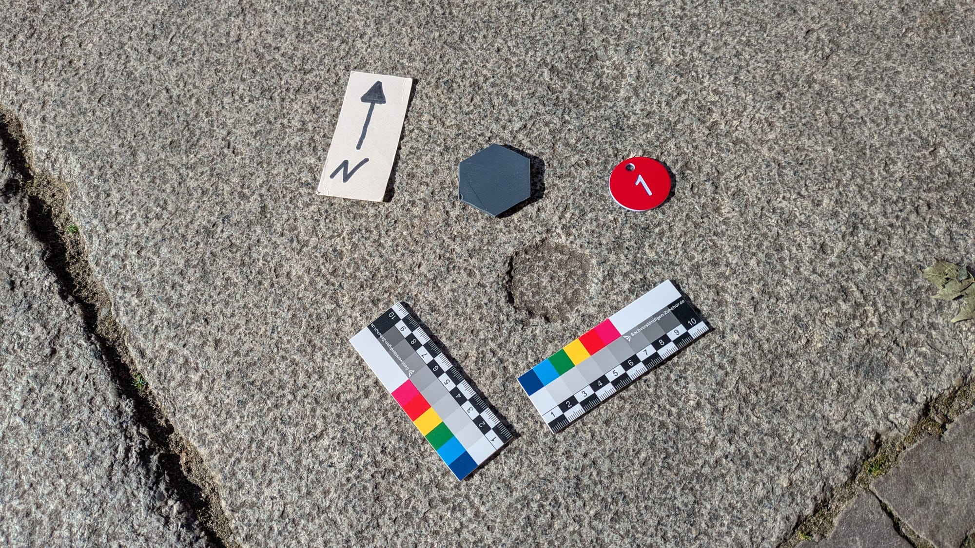 2 Sechseckabdrücke in bossierten Platten; graue Kunststoffschablone mit den Maßen einer INC 4 LB